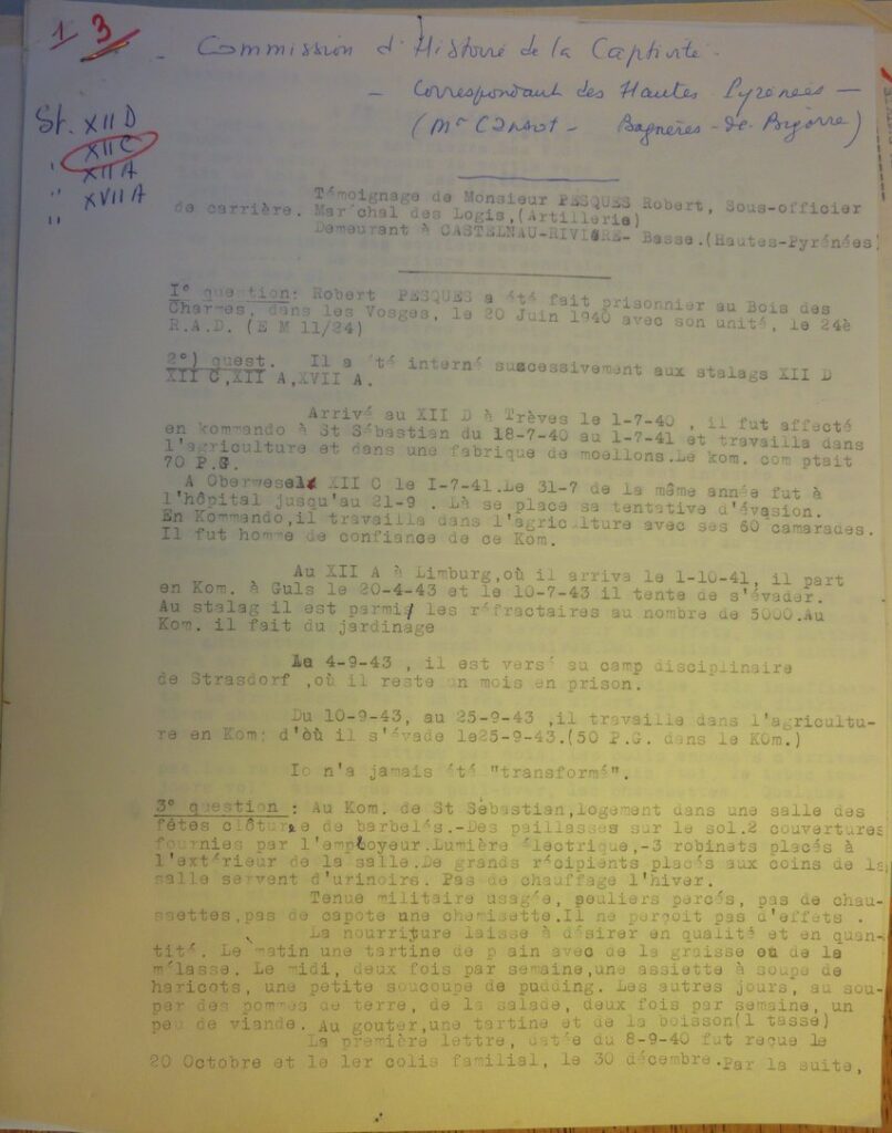 #### SRC3 ANJSC_72AJ299 P1090658.jpg, rapport PG FRA PESQUES Robert apres son retour en France Libre apres de multiples tentatives d’evasion; le premier Stalag etait le XII D avec un sejour au Kdo de Sankt Sebastian de Juillet 40 a Juillet 41; travaille dans l’agriculture et fabrique de moellons:
